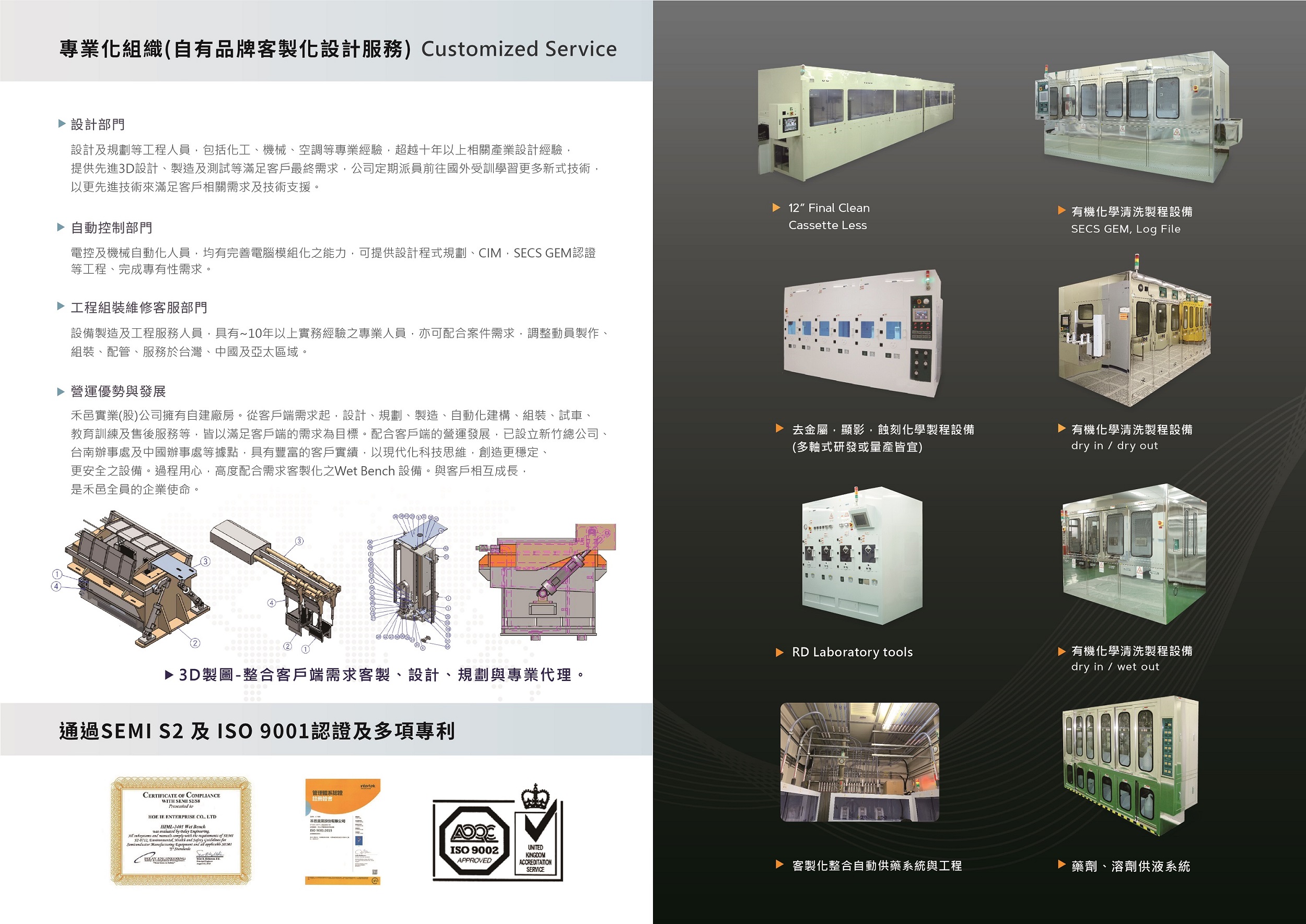 禾邑實業專責於高度配合需求客製化Wet Bench設備製造廠,包含蝕刻、清洗、有機設備、供酸系統等等。從客戶需求到設計、製造、組裝、測試、備品、售服一條龍服務,1994年開業於市場上擁有高市佔率,營業至今遍佈台灣及大陸的往來客戶超越100家,銷售之Wet Bench設備已達近千台。
